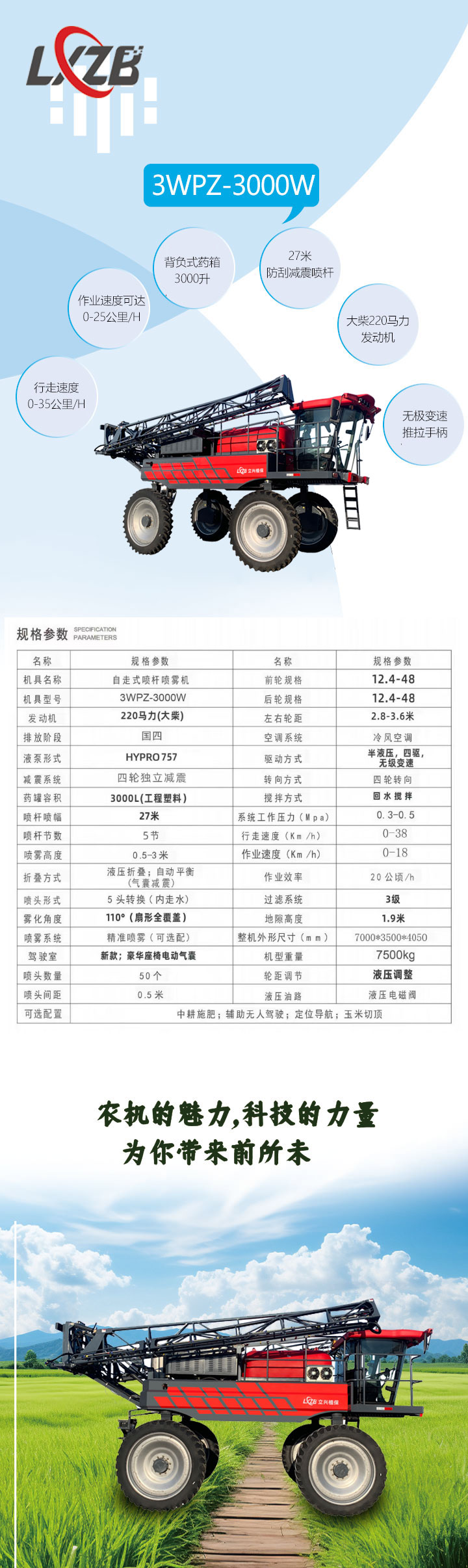 3WPZ-3000W噴藥切頂及一體的噴桿噴霧機(jī)行走速度可以達(dá)到0-35公里/H。作業(yè)速度根據(jù)作業(yè)條件可達(dá)0-25公里/H3WPZ-3000W搭配3000升的背負(fù)式藥箱;27米防刮減震噴桿,配備自動(dòng)平衡功能。五頭轉(zhuǎn)換美國(guó)噴頭。此機(jī)型采用錫柴國(guó)四排放標(biāo)準(zhǔn)220馬力發(fā)動(dòng)機(jī)。噴藥水泵采用美國(guó)HYPRO品牌大流量離心泵(757L/MIN)。機(jī)械液壓相結(jié)合的傳動(dòng)方式是立興打藥機(jī)的獨(dú)有技術(shù),已經(jīng)在10余種機(jī)型,2000多臺(tái)機(jī)器上配套使用,技術(shù)成熟可靠。原理(伊頓液壓大崩傳動(dòng)液壓馬達(dá),液壓馬達(dá)傳動(dòng)變速箱;利用變速箱換檔提升扭矩。這套驅(qū)動(dòng)技術(shù)大幅度提升了該車型的防陷能力搭配四輪獨(dú)立懸掛,減震效果優(yōu) 秀,在坑洼地塊駕駛感舒適。經(jīng)過(guò)長(zhǎng)時(shí)間高負(fù)荷泥濘地面測(cè)試。整體通過(guò)性及強(qiáng)。無(wú)極變速推拉手柄操作行走非常簡(jiǎn)單,整車全部功能都可以在扶手箱電控按鍵上進(jìn)行操作。新款豪華駕駛室,氣動(dòng)懸浮座椅。進(jìn)口智能噴霧系統(tǒng)、噴霧系統(tǒng)外走水單體110°全覆蓋噴灑,回水?dāng)嚢?,三?jí)過(guò)濾,液壓操作,可加裝精準(zhǔn)噴霧,實(shí)現(xiàn)精準(zhǔn)噴灑不浪費(fèi)藥液,達(dá)到高 效使用效果,提高了該機(jī)型操作 安 全 性,使用可靠性,維護(hù)便捷性及舒適性。