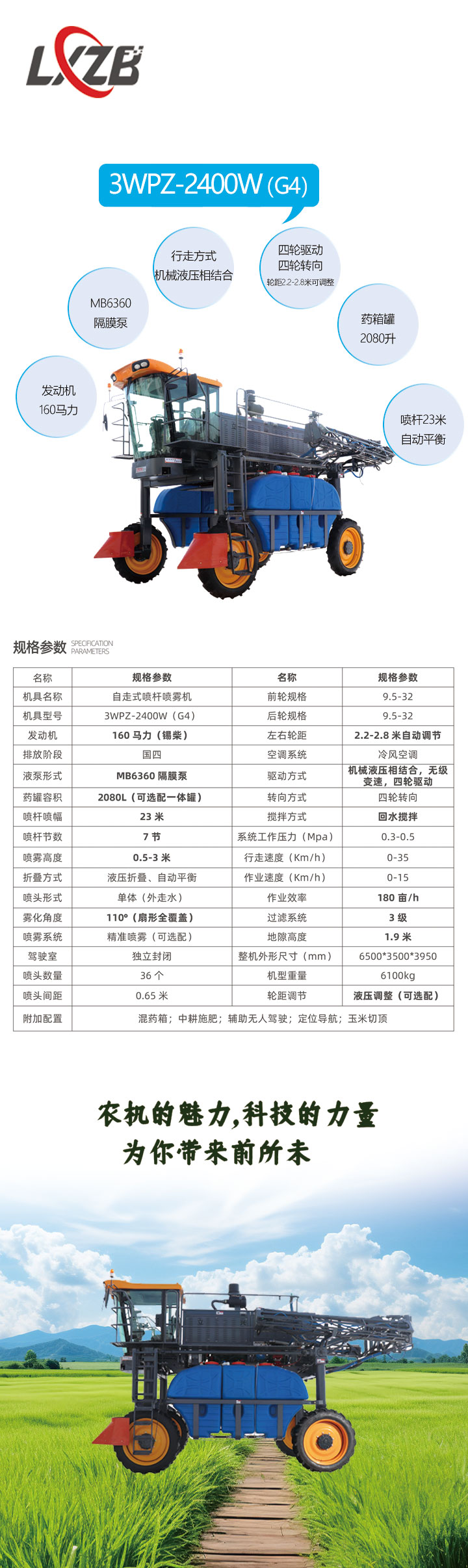 3WPZ-2400W(G4)自走式噴桿噴零機是一種集噴藥,切頂,施肥等功能于一體的噴藥設(shè)備此機型采用錫柴國四排放標(biāo)準(zhǔn)160馬力發(fā)動機,MB6360隔膜泵,配備全封閉獨立駕駛室,該機型行走方式采用機械液壓相結(jié)合的傳動方式。機械液壓相結(jié)合的傳動方式是立興打藥機的獨有技術(shù),已經(jīng)在10余種機型,2000多臺機器上配套使用,技術(shù)成熟可靠。