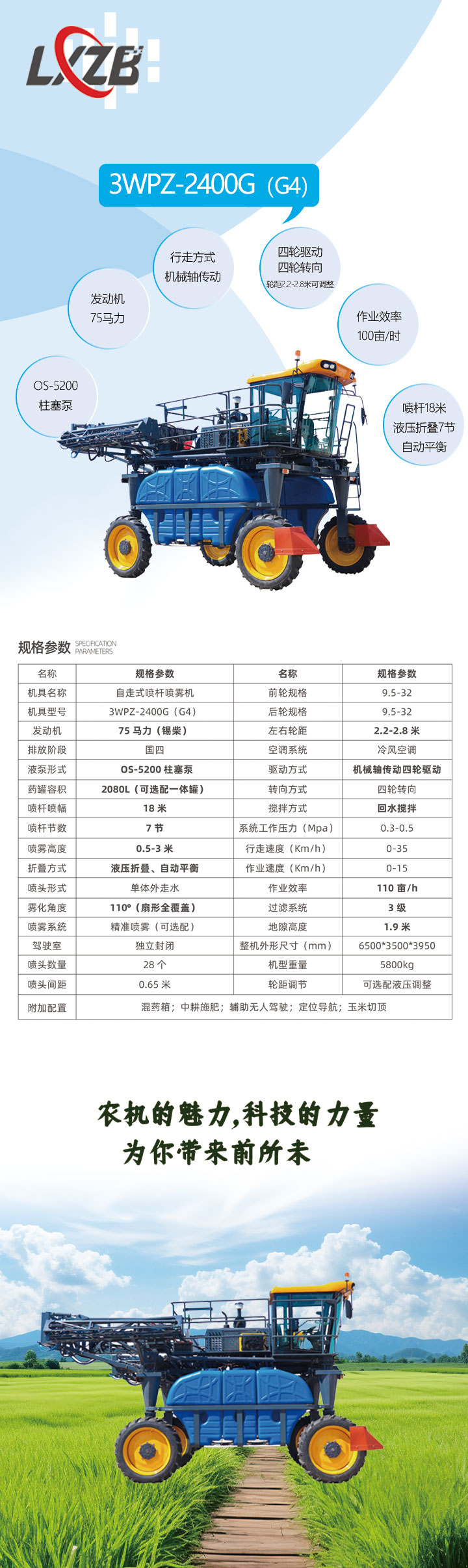 3WPZ-2400G(G4)自走式噴桿噴霧機(jī)是一種集噴藥,切頂,施肥等功能于一體的噴藥設(shè)備此機(jī)型采用錫柴國四排放標(biāo)準(zhǔn)75馬力發(fā)動(dòng)機(jī),0S-5200柱塞泵,配備全封閉獨(dú)立駕駛室。該機(jī)型行走方式采用機(jī)械軸傳動(dòng),在泥濘道路中驅(qū)動(dòng)力強(qiáng),脫困能力強(qiáng),適合多地形作業(yè);四輪驅(qū)動(dòng)四輪轉(zhuǎn)向,輪距2.2米-2.8米可調(diào)整(可選配液壓調(diào)節(jié)輪距》,設(shè)計(jì)結(jié)構(gòu)合理,維修便捷,作業(yè)質(zhì)量好,作業(yè)效率可達(dá)每小時(shí)100畝。