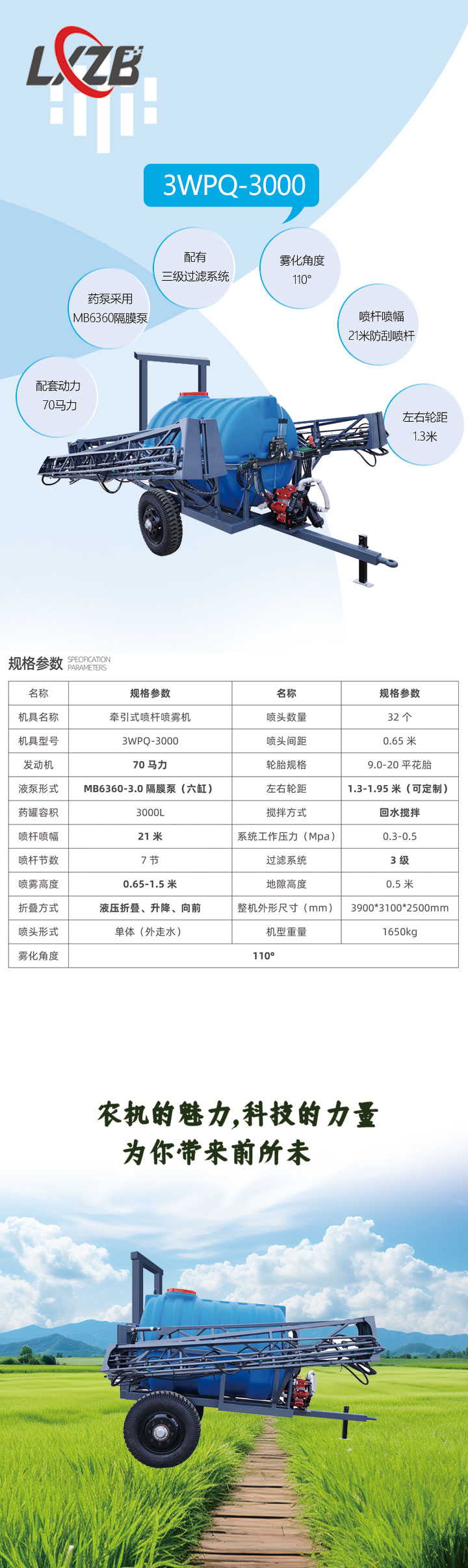 3WPO-3000牽引式噴桿噴霧機(jī),配套動(dòng)力270馬力,藥泵采用MB6360隔膜泵,配有三級(jí)過(guò)濾系統(tǒng),回水?dāng)嚢韫δ埽幭淙莘e3000L,噴桿噴幅21米防刮噴桿,噴霧高度0.65-1.5米,霧化角度110°,噴桿液壓折疊升降,左右輪距1.3米(可定制)地隙高度0.5米,適合中大型平原地塊噴灑作業(yè)需求。