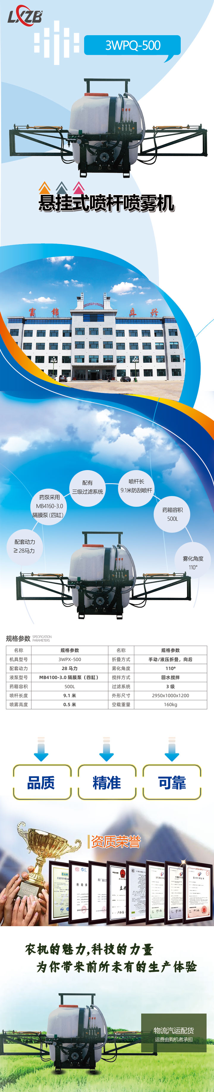 3WPX-500懸掛式噴桿噴霧機配套動力228馬力,藥泵采用MB4160-3.0隔膜泵(四缸),配有三級過濾,回水攪拌功能藥箱容積500L,噴桿長9.1米防刮噴桿,噴霧高度0.5米,霧化角度110°,手動/液壓折疊,向后,小容積懸掛噴桿噴霧機更適合小地塊矮作物的作業。