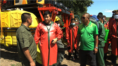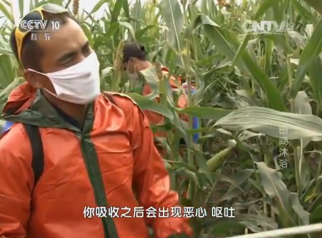 給高桿作物噴藥可不是一件輕松的工作,就拿玉米來說,田里作物生長得十分茂盛,幾乎密不透風,頂著烈日在這里工作非常難受,而且在下到田地里之前,記者還被要求穿上厚厚的防護服,因為噴灑的農藥含有劇毒,只有這樣,才能進入高桿作物的所在地進行采訪。