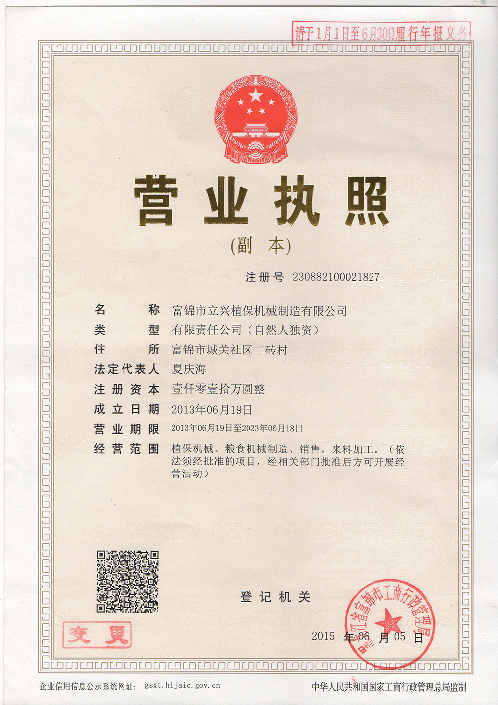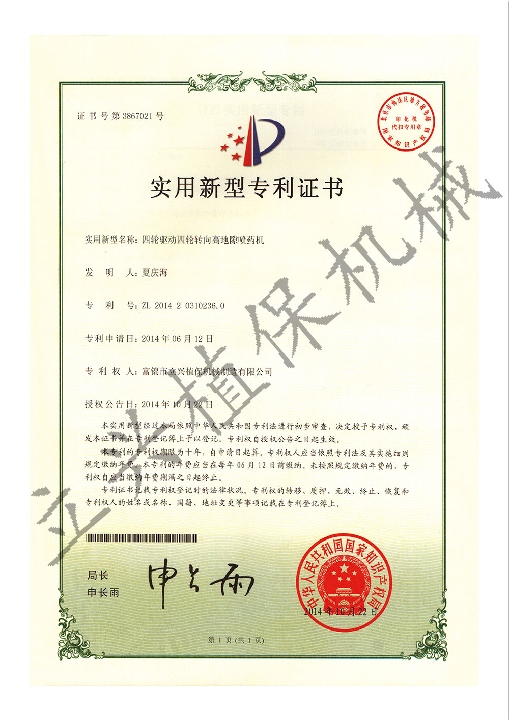 富錦市立興植保機械制造有限公司,成立于2005年,位于黑龍江省富錦市工業園區,是專業研發、生產及銷售的植保機械制造企業。企業發展的行業屬于國家重點支持的新興戰略產業,已擁有"立興"等注冊商標,公司通過了ISO9001質量管理體系認證、CCC國家強制性產品認證和農業部農業機械推廣鑒定認證,并獲得了相關資質證書,其中五種機型3WPZ-2400、3WPZ-1200、3WPZ-600、3WPQ-2000、3WPX-1000已進入國家補貼目錄,并在各省、自治區及農墾兵團農機推廣目錄中歸檔銷售,用戶購買我公司產品就可以享受國家補貼政策。