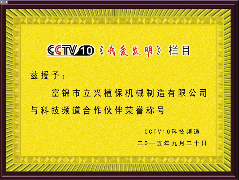 中央電視臺我愛發明欄目《田間沐浴》合作伙伴證書
