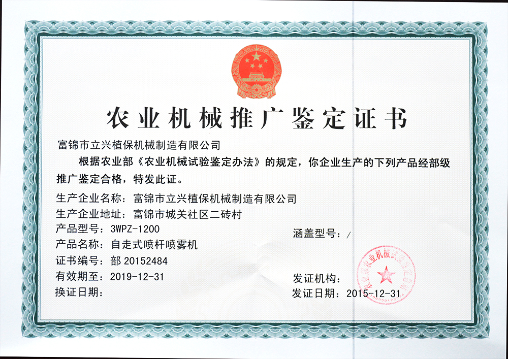 農業部農業機械推廣鑒定認證證書