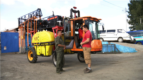 根據夏師傅的介紹,這臺噴藥機可以在高桿作物農田里行進噴藥,它尾部的噴桿可以調整高度,高可以到達2.5米,而噴桿噴出的農藥會形成水霧,均勻地噴灑在葉片上,達到驅逐害蟲的效果。